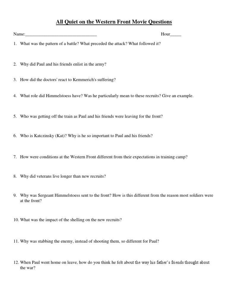 All Quiet On The Western Front Movie Questions Pdf Western Front World War I Military